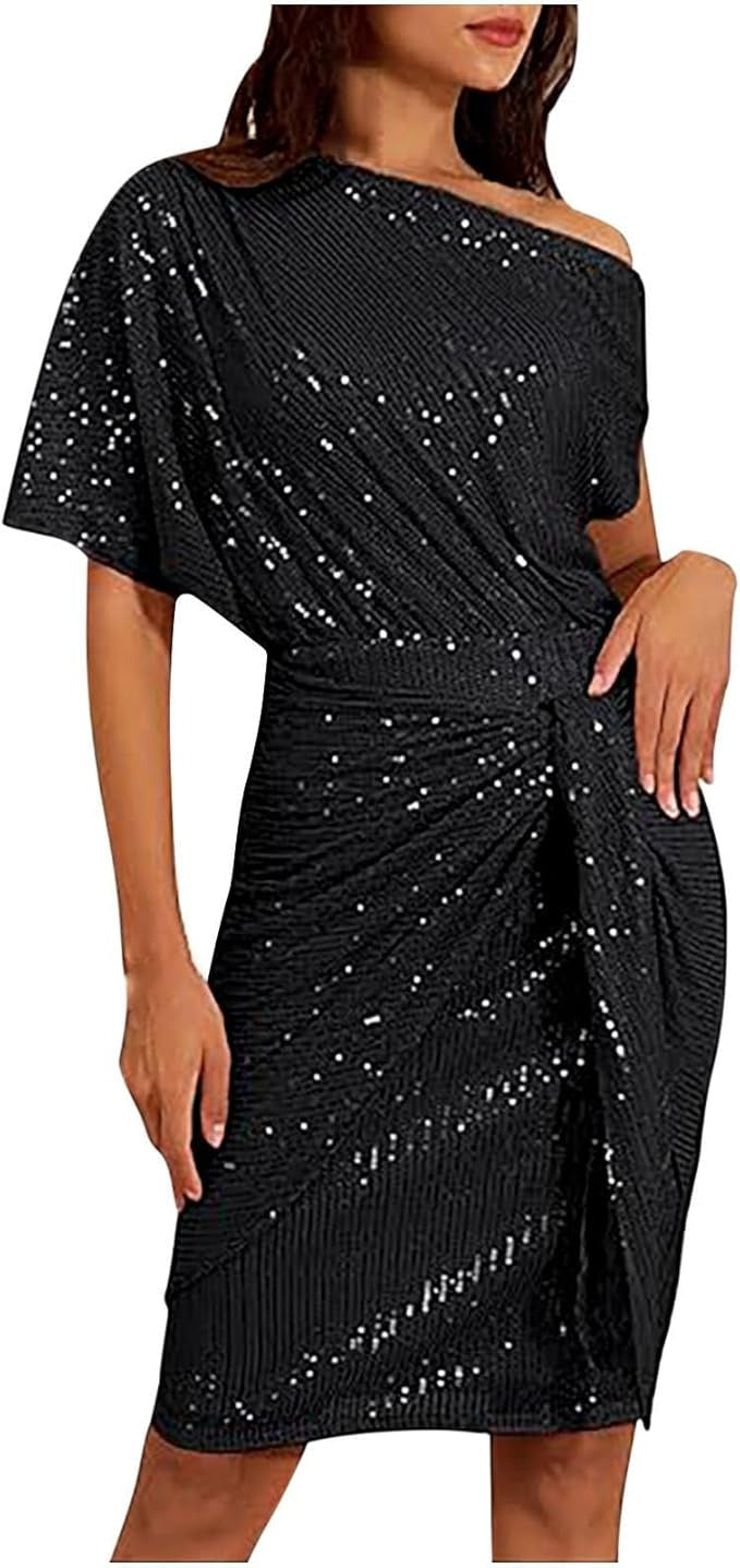 Women's Sequin Glitter Party Club Dress One Shoulder Ruched Cocktail Bodycon Dress Elegant Sparkly Wrap Party Club Evening Gown